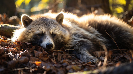 Nyctereutes procyonoides. Autumn colors in nature. Free nature. Animal in the forest. Colorful leaves.The original area is located in East Asia, especially in Japan, Korea and eastern Siberia. His hom