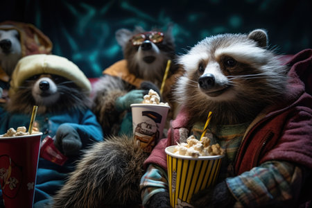 Raccoons watching movie in colorful outfits holding popcorn, fun concept, AI Generated