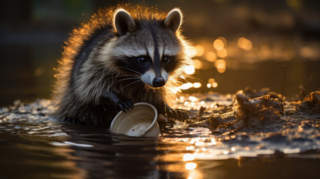 a raccoon holding a cup in water
