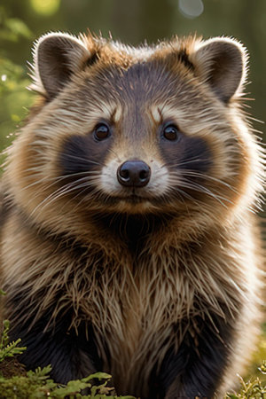 Close-up portrait of a raccoon with black facial mask and bright eyes, curious animal in the zoo
