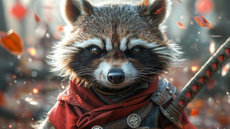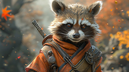 An isolated Ninja KungFu Raccoon is surrounded by a white background. Artist concept illustration of a video game character designed in the traditional cartoon style on a white background.