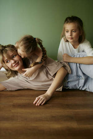 Mother and two funny daughters laughing and playing together. Sisters. Friendship. family relationships. green wall. natural light. love and happiness. Emotional and cute girls. Casual home clothes.