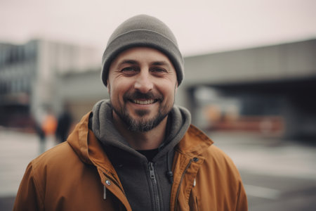 Handsome young man with a beard and mustache, wearing a yellow coat and gray hat, smiling and looking at the camera