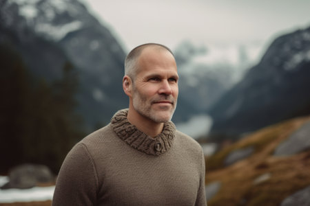 Handsome middle-aged man in a sweater against the backdrop of mountains