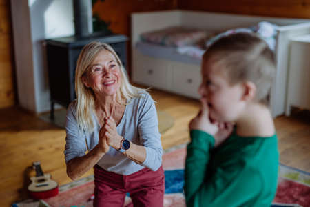 Happy boy with Down syndrome playing with his grandmother at home.