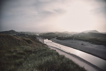 A river on a sandy beach during an evening