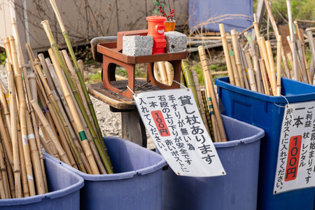Kotohira, Kagawa, Japan - April 7 2024 : lending cane 100 yen per stick at Konpira Shrine Omotesando street.