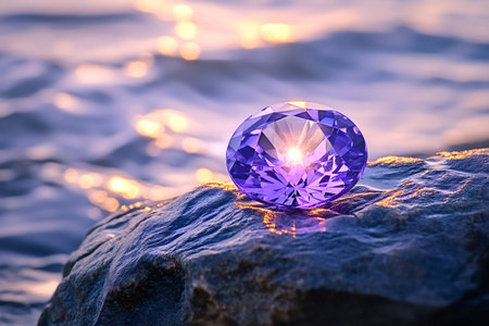 Large, faceted purple gemstone shining brilliantly on a rock by the sea, catching the golden sunset light as it reflects off the rippling water, creating a serene and tranquil atmosphere