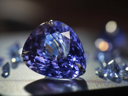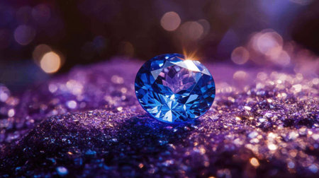A stunning blue gemstone rests on a glimmering purple surface, illuminated by soft bokeh lights, creating an enchanting and luxurious atmosphere.