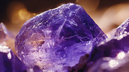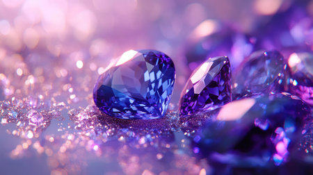 A collection of stunning purple gemstones shimmering on a sparkling surface. The soft focus and bokeh effects enhance the luxurious feel, perfect for beauty and luxury themes.