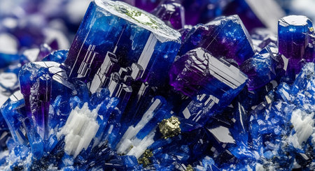 Brightly colored crystals reveal shades of blue and purple, exhibiting sharp edges and unique structures that reflect light in captivating ways.