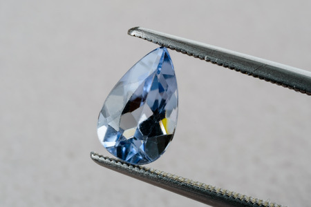 Fine blue drop shaped blue beryl, aquamarine, gemstone held by tweezers.
