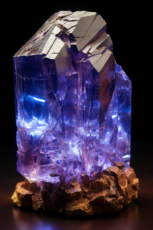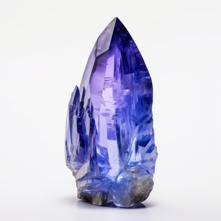 a stunning tanzanite crystal, showcasing an elegant blue color, resembling conceptual light sculptures. the crystal features a beautiful blend of light white and dark purple hues, as well as light purple and dark azure tones. the high-key lighting enhances its brilliance, while the stone's chase, spiky mounds, and varying levels of opacity and translucency add to its unique charm. ai generated