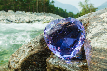 A brilliant faceted purple gemstone rests on a rock with a scenic river and forested mountains in the background