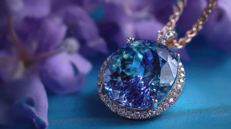 A stunning blue gemstone pendant elegantly displayed, highlighting its intricate design and sparkling details amidst a soft floral backdrop. Perfect for jewelry lovers.