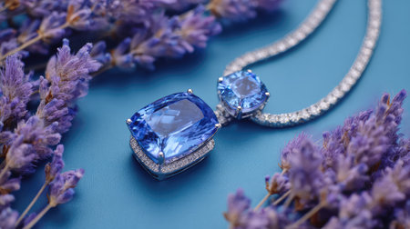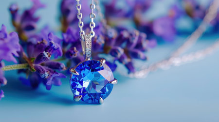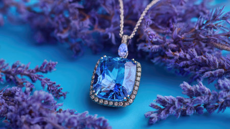 A stunning blue gemstone pendant necklace elegantly displayed among lavender flowers on a vibrant blue backdrop, ideal for showcasing luxury jewelry and floral beauty.