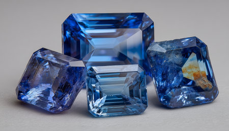 Four Square-Cut Blue Sapphires on a Neutral Background, Gemstone Photography, Jewels Collection