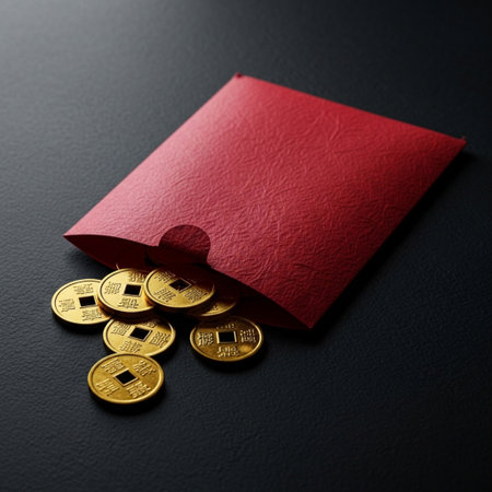 A beautifully arranged Chinese New Year scene with red envelopes, golden coins, and oranges, leaving space in the middle for messages or graphics