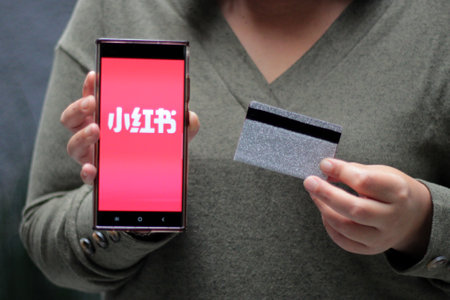 KYIV, UKRAINE - APRIL 1, 2024 Xiaohongshu icon on smartphone screen and money in female hand. iPhone display with app logo and japanese yen money bills in women hands close up