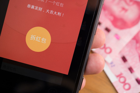 Zhongshan,China-Feb 21,2016:getting a mobile red pocket for Chinese new year with RMB on background.FEB 8 is the 1st day of Year of Monkey & sending receiving red pockets online is very popular in China.