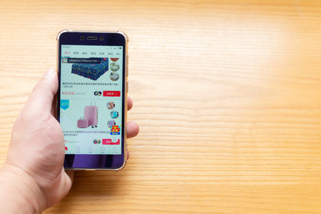 CHIANG MAI, THAILAND - Mar 18,2018: Man hands holding HUAWEI with alibaba apps on screen.