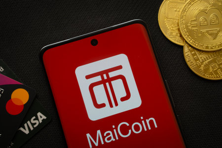 Dhaka, Bangladesh- 06 Sep 2025: Smartphone displaying MaiCoin logo surrounded by Bitcoin coins and payment cards.