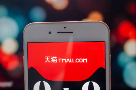 Calgary, Alberta. Canada May 22, 2020. A phone with Tmall on the screen. Tmall.com, formerly Taobao Mall, is a Chinese-language website for business-to-consumer online retail, spun off from Taobao, operated in China by Alibaba Group