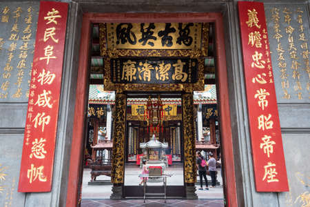 Ho Chi Minh City, Vietnam - April 27, 2019: an interior (a view from the entrance) of Hoi Quan Nghia An pagoda in Nguyen Trai Street, Cho Lon (Chinatown of Saigon).