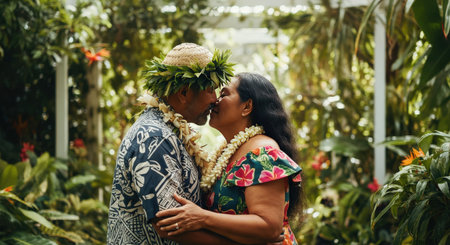 Hawaiian couple kissing in tropical garden capturing romance and tradition