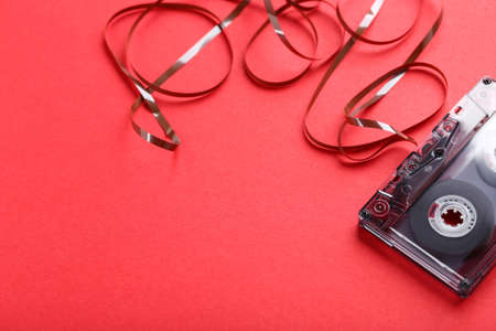 Top view Audio cassette. Vintage audio cassette on colored background. Old cassette tape audio isolated on red