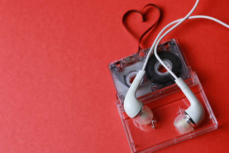 Transparent audiocassette surrounded by a cord of headphones in the shape of a heart on a white background
