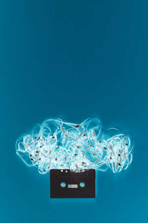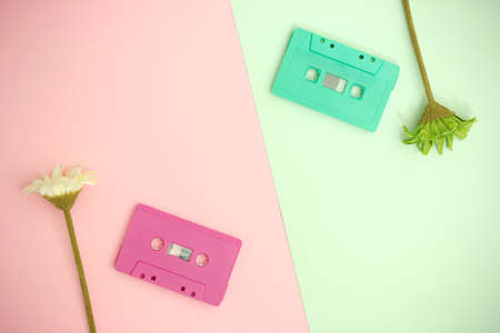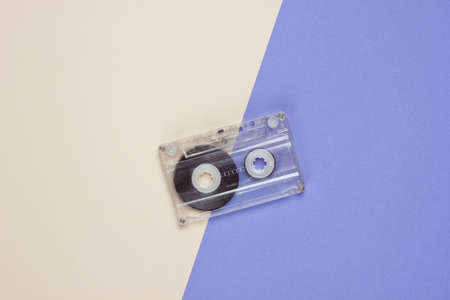 Audio cassette on colored paper background. Studio retro shot. 80s, pop culture. Top view.