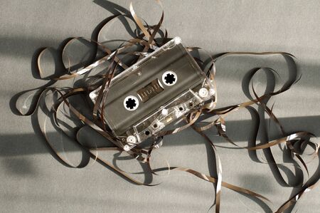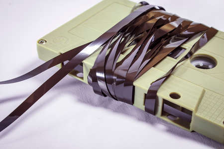 Audio tape cassette with subtracted out tape. Old broken cassette