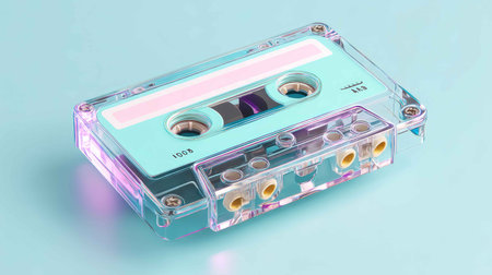 A vibrant neon cassette tape embodies s nostalgia, symbolizing the golden era of music on analog media. Perfect for fans of retro culture, vintage aesthetics, and colorful designs reflecting the