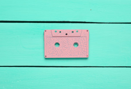 Retro audio cassette on a turquoise wooden background. Trend of minimalism. The concept of obsolete audio technology. Top view.