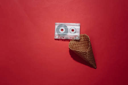 Ice cream waffle cone with retro audio cassette on red bright background. top view