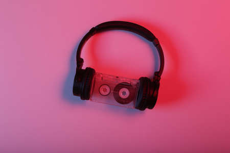 Audio cassette and earphones on a blue pink pastel background. Musical love concept. Retro style. Minimalism. Top View