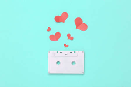 White painted audio cassette and hearts on blue background. minimalism. top view
