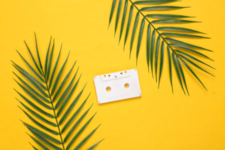 Audio cassette and palm leaves on yellow background. Tropical music composition. top view. flat lay
