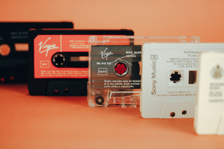 Old vintage cassettes for tape recorder, music player. Nostalgia for 90s, 00s.