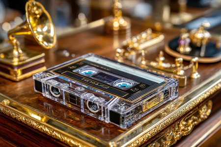 A classic cassette tape placed on a beautifully crafted wooden surface, surrounded by vintage musical items.