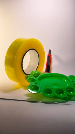 A large roll of yellow transparent shipping tape positioned in front of a utility knife and plastic office supplies for packaging and moving