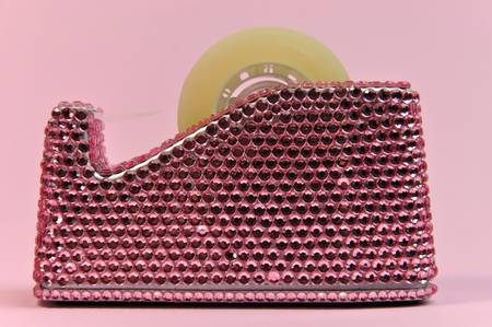 Pretty in Pink bling office accessory tape dispenser isolated against a pale pink background