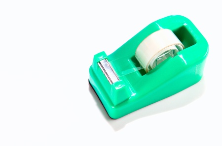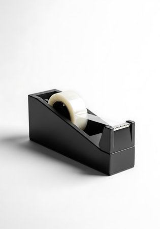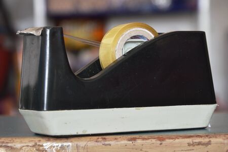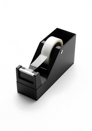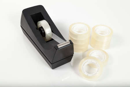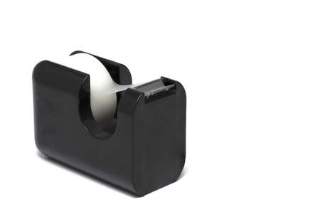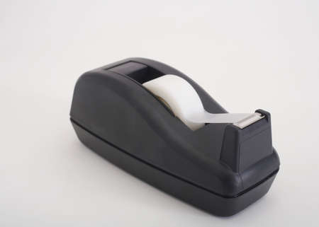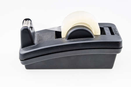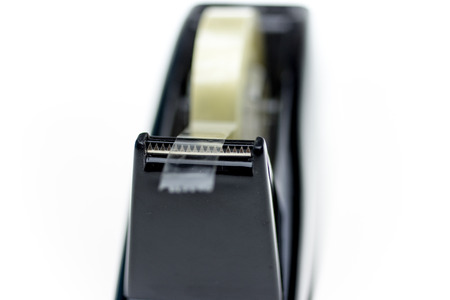 Close up partial side view of black office tape dispenser with clear tape and cutter on white background