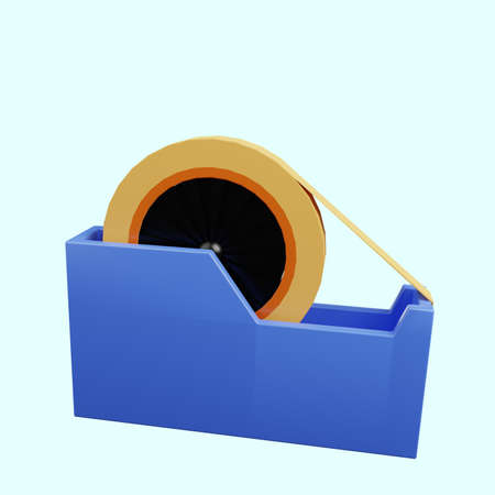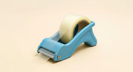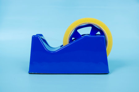 A light blue plastic tape dispenser holds a roll of clear adhesive tape. The dispenser sits on a neutral, light-colored surface.