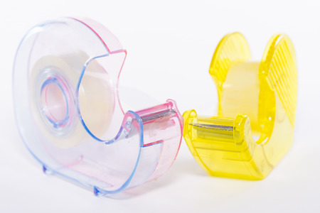 Tape showing pink transparent tape dispenser with tape roll. High resolution image suitable for commercial use. Clear details and vibrant colors enhance visual appeal.