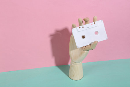 Wooden hand holding audio cassette on blue pink pastel background. trendy shadow. concept art. minimalism