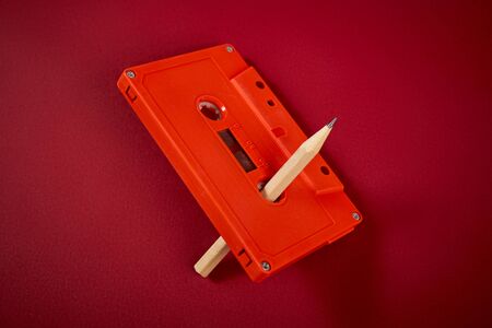 Top view Audio cassette. Vintage audio cassette on colored background. Old cassette tape audio isolated on red