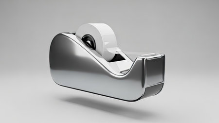 A shiny metallic tape dispenser is featured against a simple gray backdrop. The object is rendered with a smooth, reflective surface, suggesting a modern design. The composition is clean and minimalistic, allowing for versatile application in various commercial projects. The lighting is soft, creating gentle shadows.