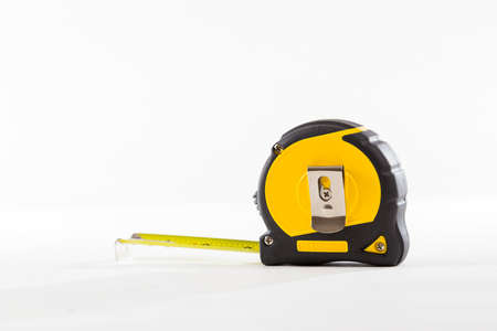 Measuring roulette yellow black on a white background banner with space for text. A construction tool